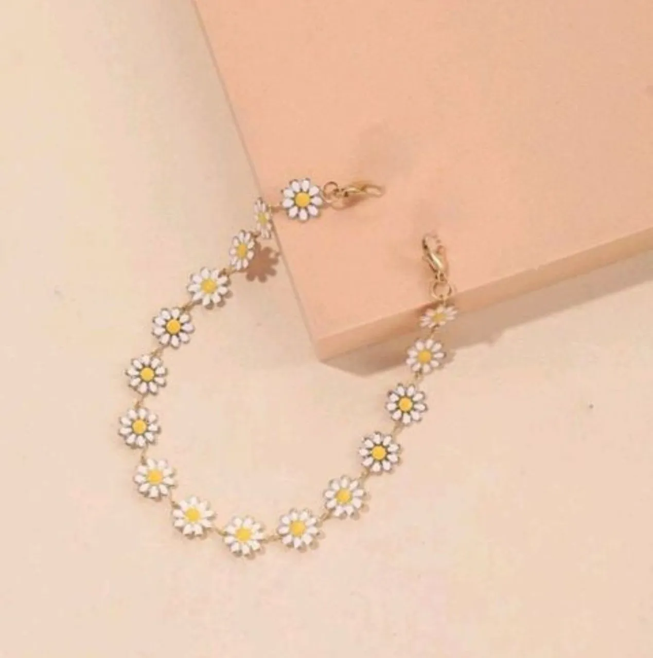 linda pulseira de margaridas, perfeita para um toque de delicadeza e charme no seu visual. com design floral e detalhes encantadores, esta pulseira é o acessório ideal para qualquer ocasião. adicione um toque de primavera ao seu look!
