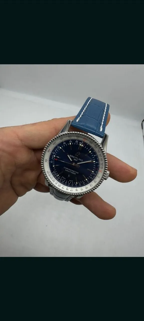 Relógio Breitling Navitimer, um clássico da aviação com design icônico e precisão cronométrica. Caixa elegante e pulseira em couro azul.