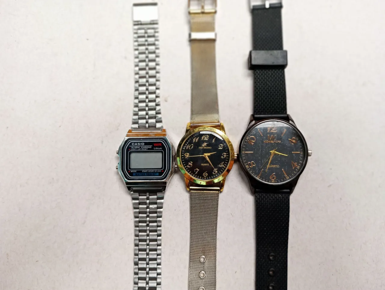 (C11) Lote com 3 relógios: 1 estilo Casio, 1 feminino e 1 unissex. Aparentemente não originais. Estão parados, precisam colocar bateria ou possível conserto. Pulseiras em bom estado, completos e bem conservados. Ideais para retirada de peças, manutenção ou revenda. Vendidos no estado.