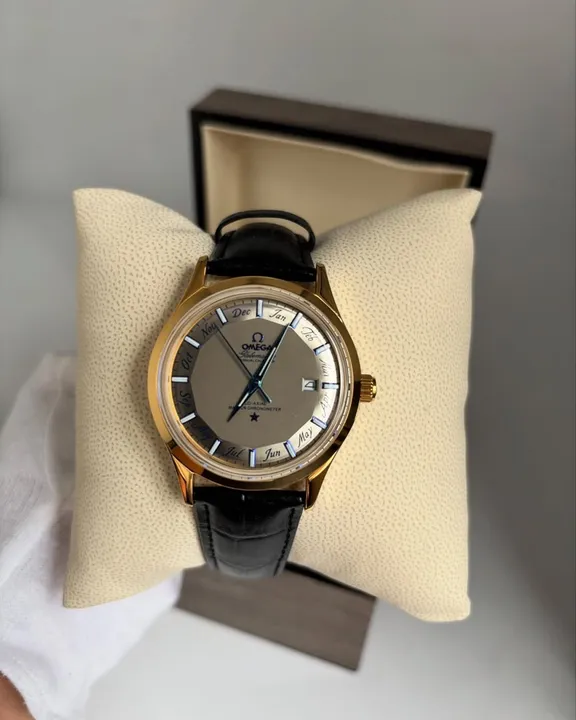 Relógio Omega Globemaster Automático impecável, com caixa em aço inoxidável e pulseira de couro. Possui mostrador elegante em dourado e calendário completo, além de resistência à água. Uma peça clássica e sofisticada para qualquer ocasião.