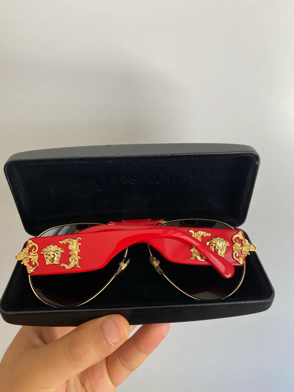 Estes são óculos de sol da marca Versace, modelo VE2150Q 100211, apresentando uma estrutura estilo aviador dourada com hastes vermelhas detalhadas. Aceito oferta
