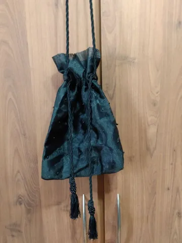 Bolsa de tule forrada, estilo saco, pequena. Tem bordados e cordão regulável. Medidas: 30cm de comprimento, 19cm de largura e a alça é regulável e tem mais ou menos 82cm.