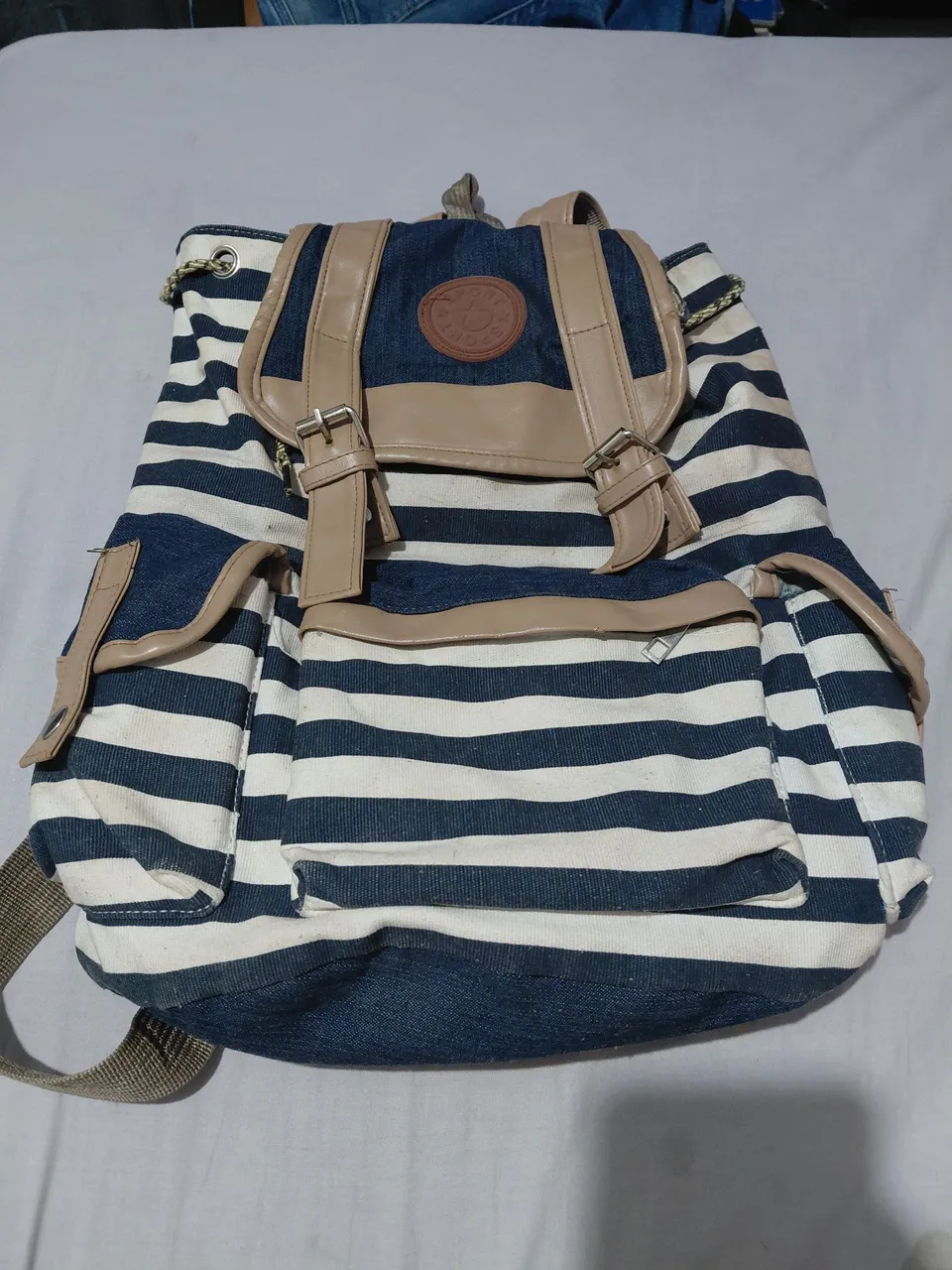 Linda bolsa feminina com design listrado em azul e branco, perfeita para um visual moderno e estiloso. Ideal para o dia a dia, com espaço e praticidade para carregar seus pertences.
