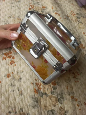 Maleta pequena de acrílico decorada. não possui chave. medida Largura 14x10cm Altura 10cm Alça 4cm