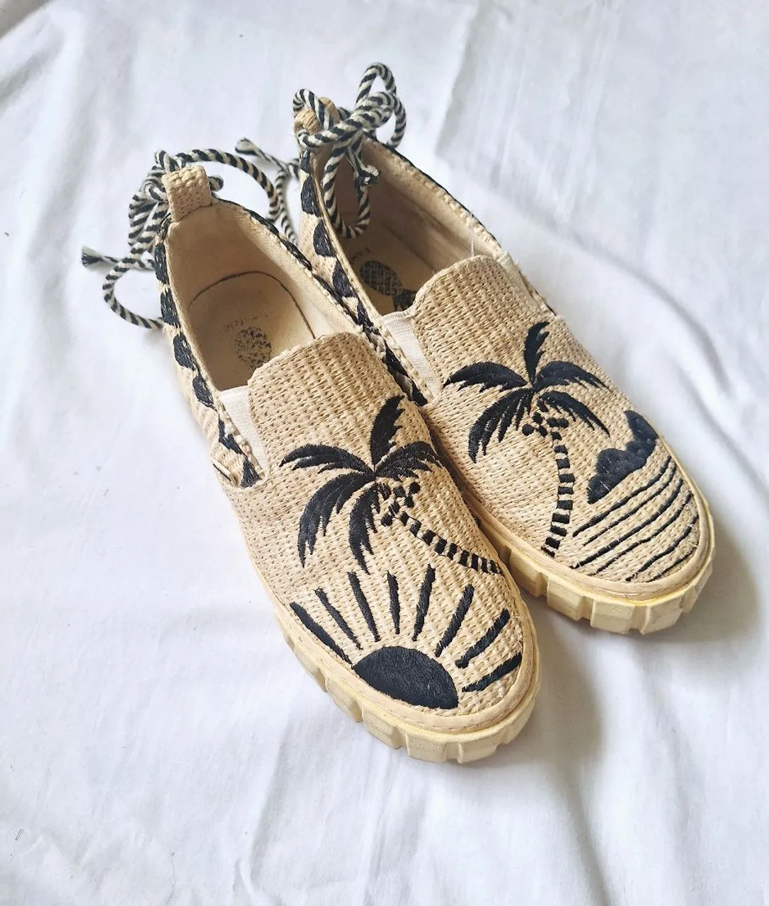 Tênis da Farm com solado tratorado, tecido de palha bordado, corda para amarrar no tornozelo podendo ser usado sem. Tem poucas marcas de uso. Tamanho 36 e é um modelo bem justo. Medida da palmilha 24.5 cm.