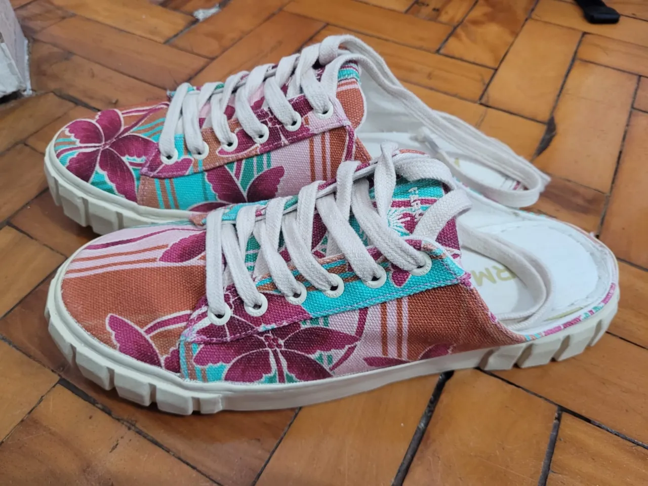 Charmosos tênis mule da Farm, com estampa floral vibrante. Perfeito para um visual cheio de personalidade.