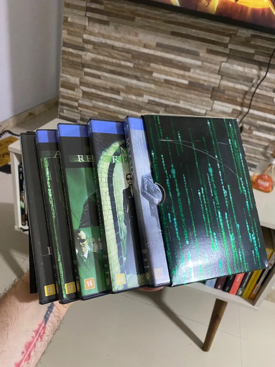 Box com os filmes da trilogia Matrix. Uma experiência cinematográfica épica, repleta de ação e efeitos visuais inovadores.