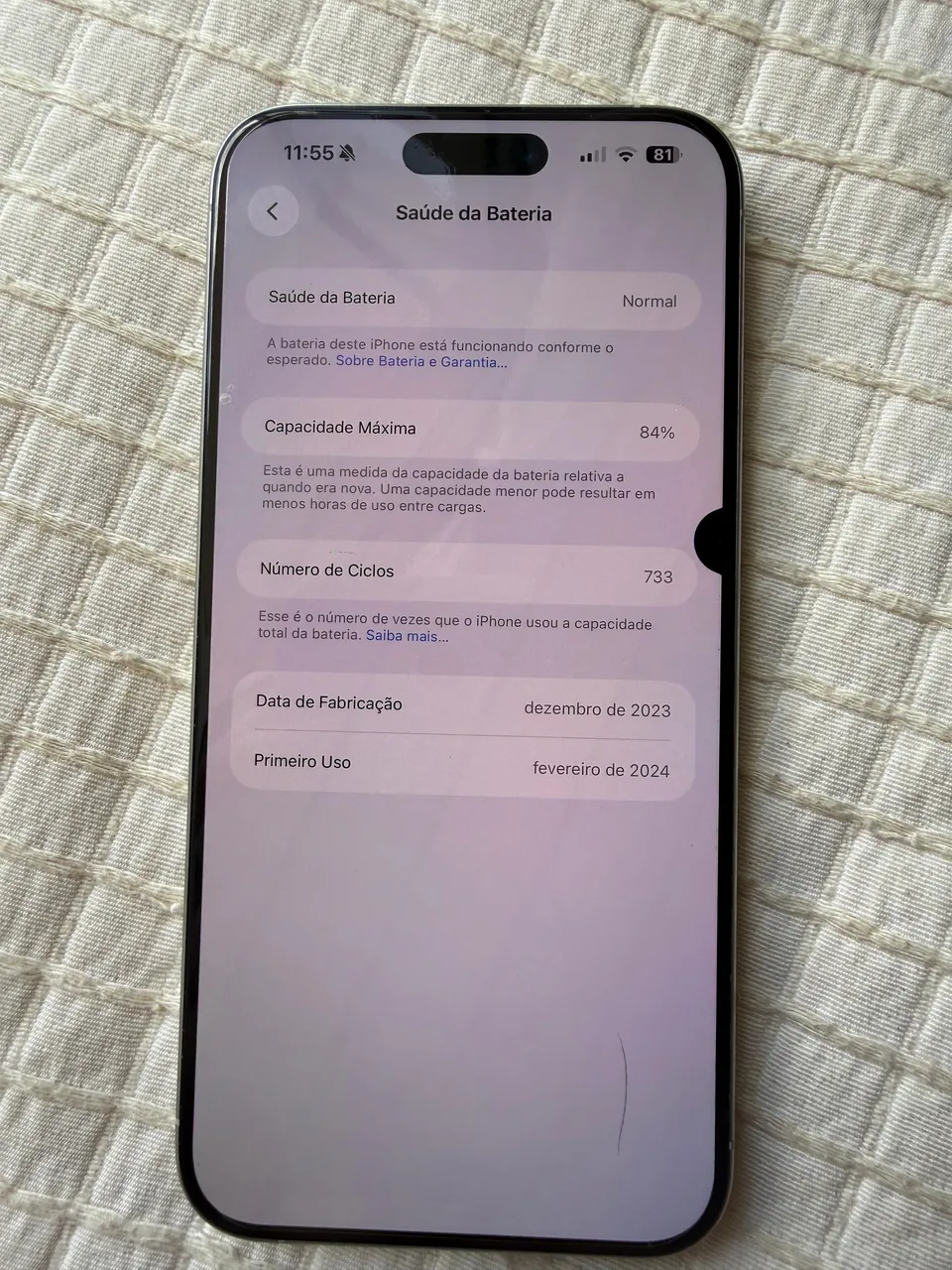 O iPhone está em ótimo estado, não tem nenhum risco, nunca foi aberto ou trocado peças, tem caixa e nota fiscal.