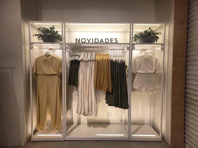 Araras, expositores, prateleiras, nichos, vitrines, painéis, sapateiras, bases de manequim e outros acessórios.