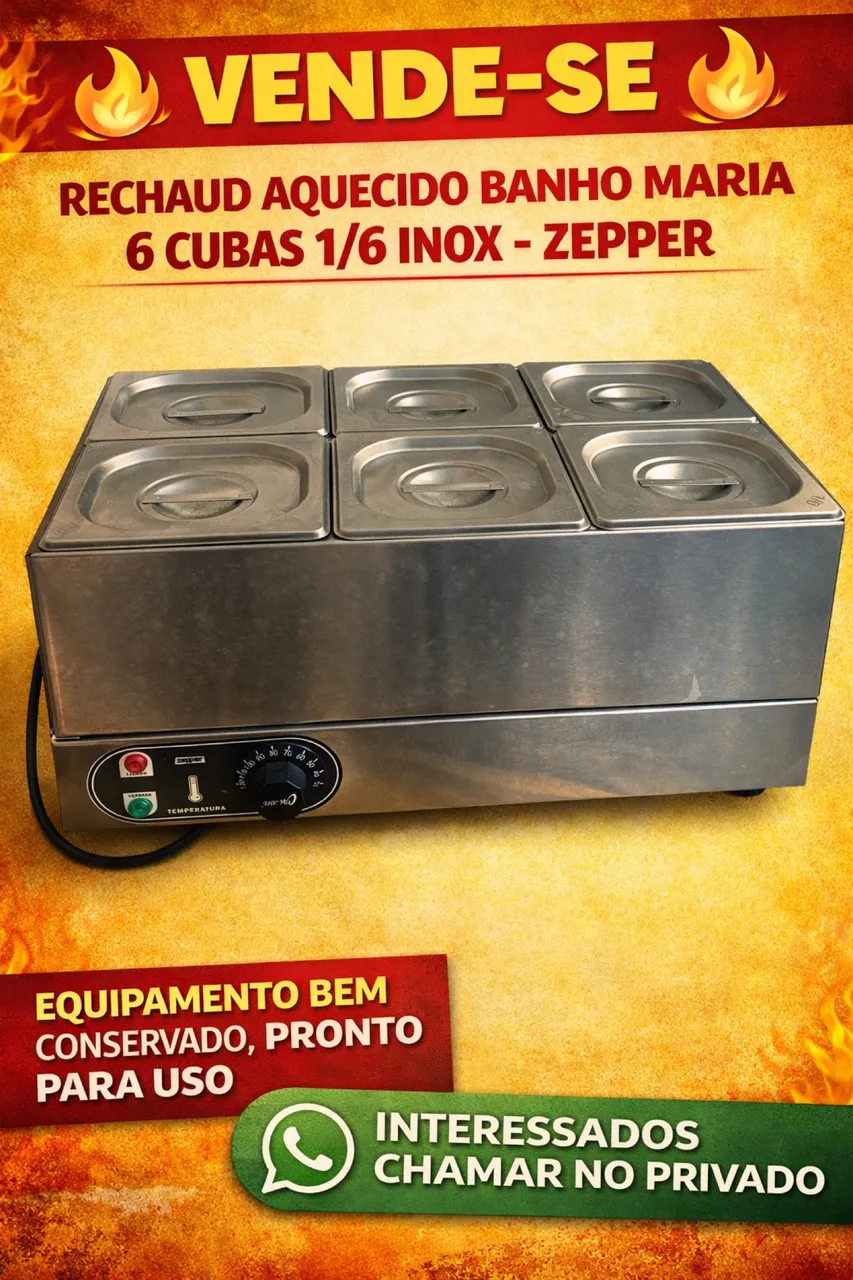 Rechaud aquecido Banho Maria com 6 cubas 1/6 em aço inox da Zepper. Ideal para manter seus alimentos aquecidos com eficiência e qualidade. Equipamento bem conservado e pronto para uso!