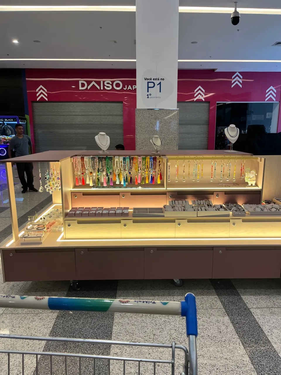 Carrinho expositor de joias ideal para shoppings. Design moderno, iluminação interna e amplo espaço de exposição para seus produtos. Perfeito para atrair clientes e aumentar as vendas. Possui rodinhas para fácil movimentação