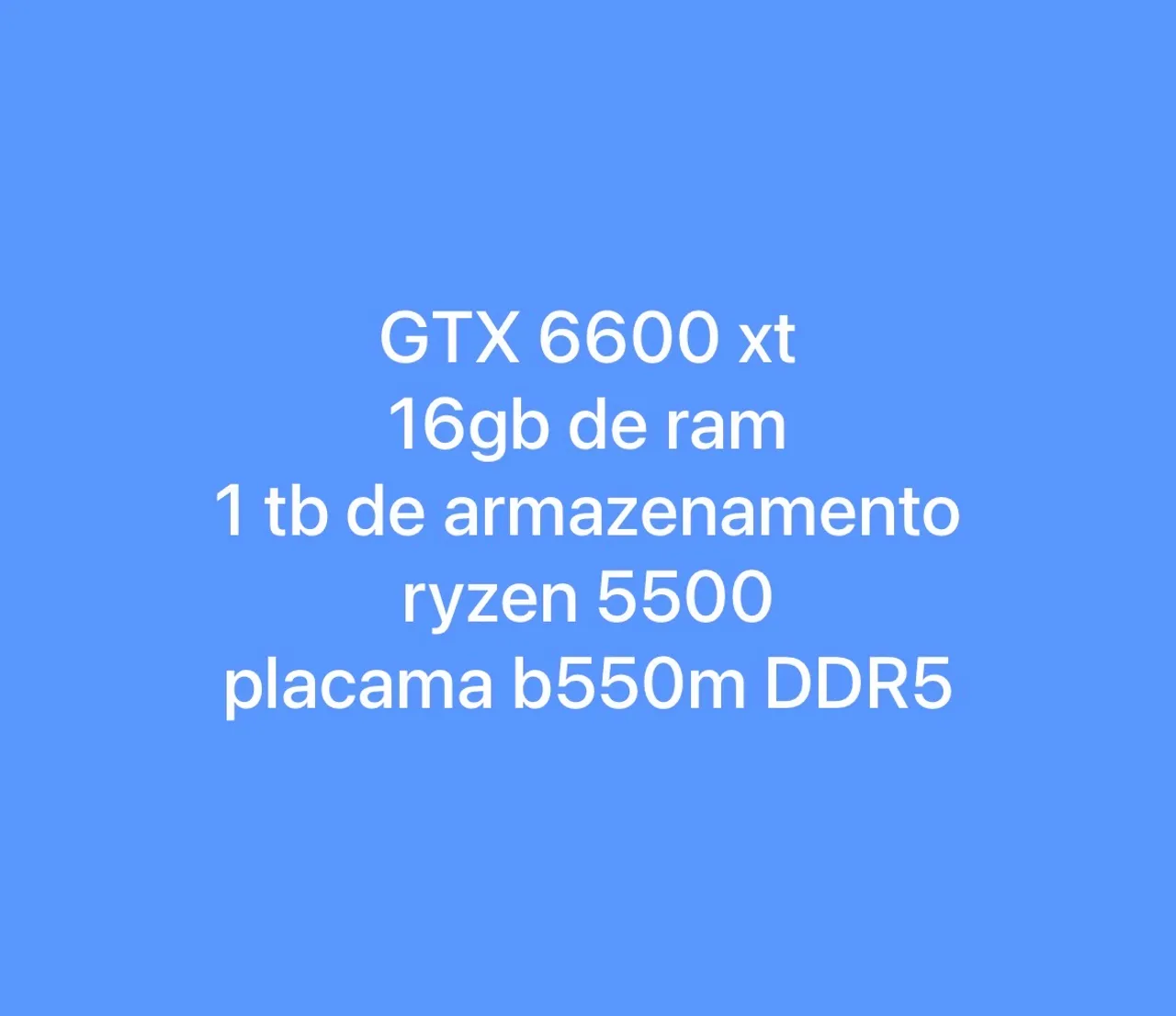 Prepare-se para uma experiência de jogo imersiva com este PC Gamer! Equipado com uma placa de vídeo GTX 6600 xt, 16GB de RAM e 1TB de armazenamento, este PC oferece desempenho e velocidade. O processador Ryzen 5500 e a placa-mãe b550m DDR5 garantem uma performance incrível. Mergulhe nos seus jogos favoritos com qualidade e fluidez!