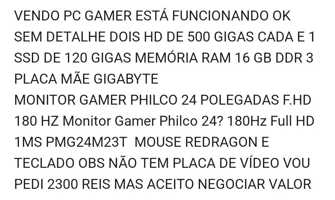 PC Gamer completo para você! Com dois HDs de 500GB, 1 SSD de 120GB e 16GB de memória RAM DDR3, este PC oferece desempenho e velocidade. Acompanha monitor gamer Philco de 24 polegadas com 180Hz e mouse Redragon. Perfeito para seus jogos!