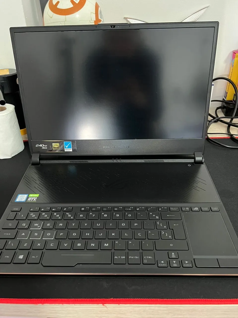 Notebook gamer Asus ROG Zephyrus com tela de alta taxa de atualização e teclado retroiluminado. Desempenho impressionante para jogos e tarefas exigentes.