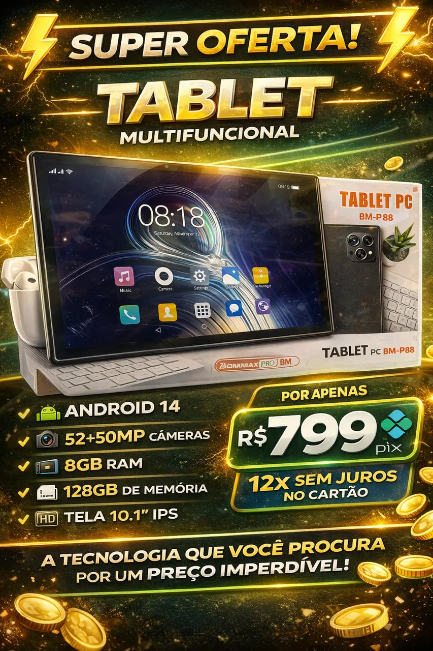 Tablet Multifuncional com Android 14, câmeras de 52+50MP, 8GB de RAM e tela HD de 10.1" IPS. 128GB de memória para você armazenar tudo o que precisa. Tecnologia que você procura por um preço imperdível!