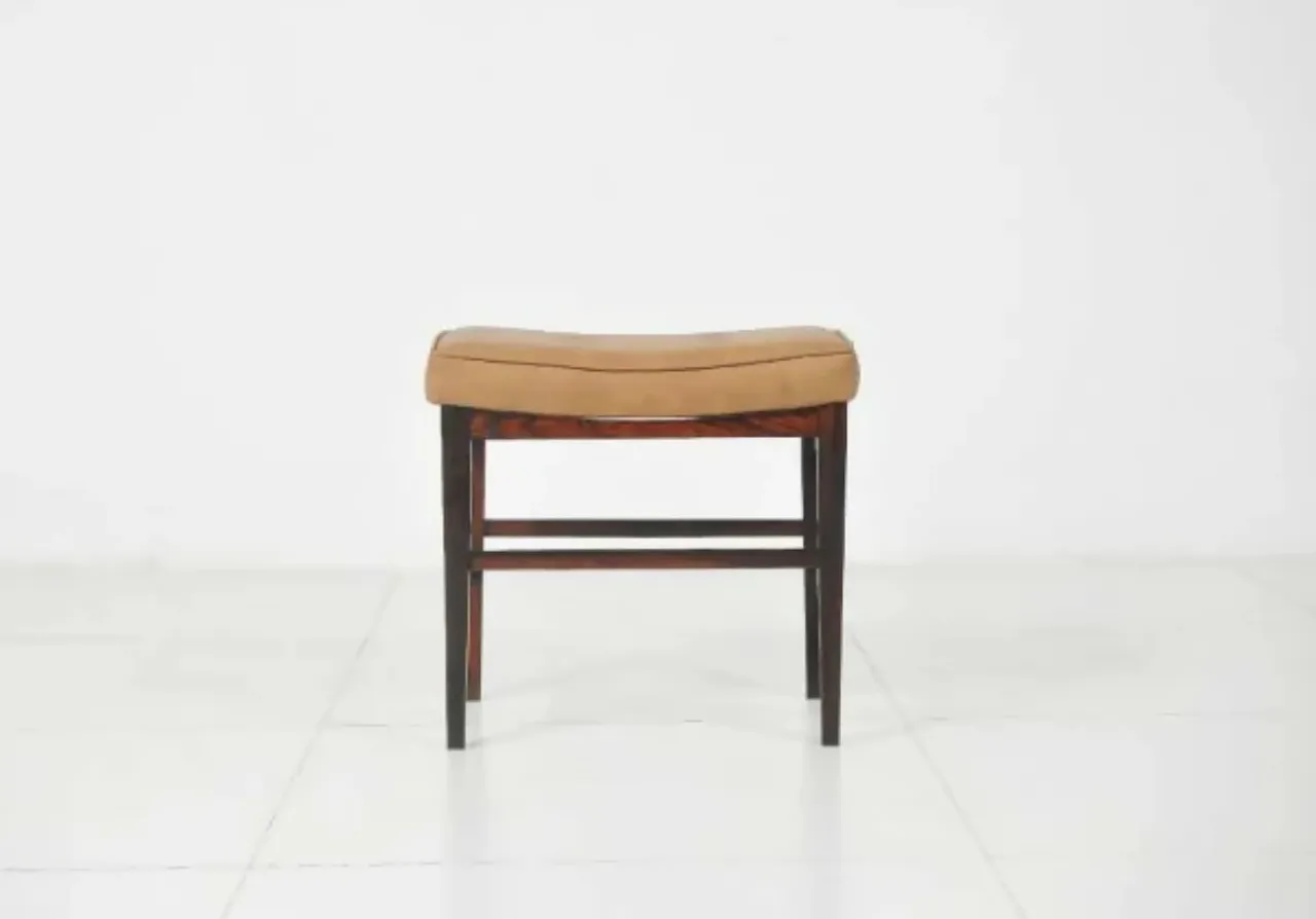 Belíssimo banco da década de 60, executado em jacarandá maciço em linhas retas, assento estofado em couro sintético, peça já restaurada | Med.: Alt. 47 cm x Larg. 50 cm x Prof. 37 cm.