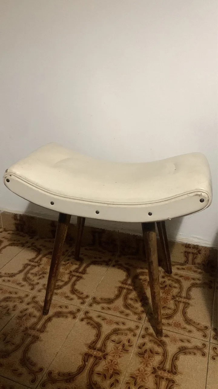 Linda banqueta com design vintage, perfeita para complementar qualquer ambiente. Assento de couro original. Pés palito em madeira