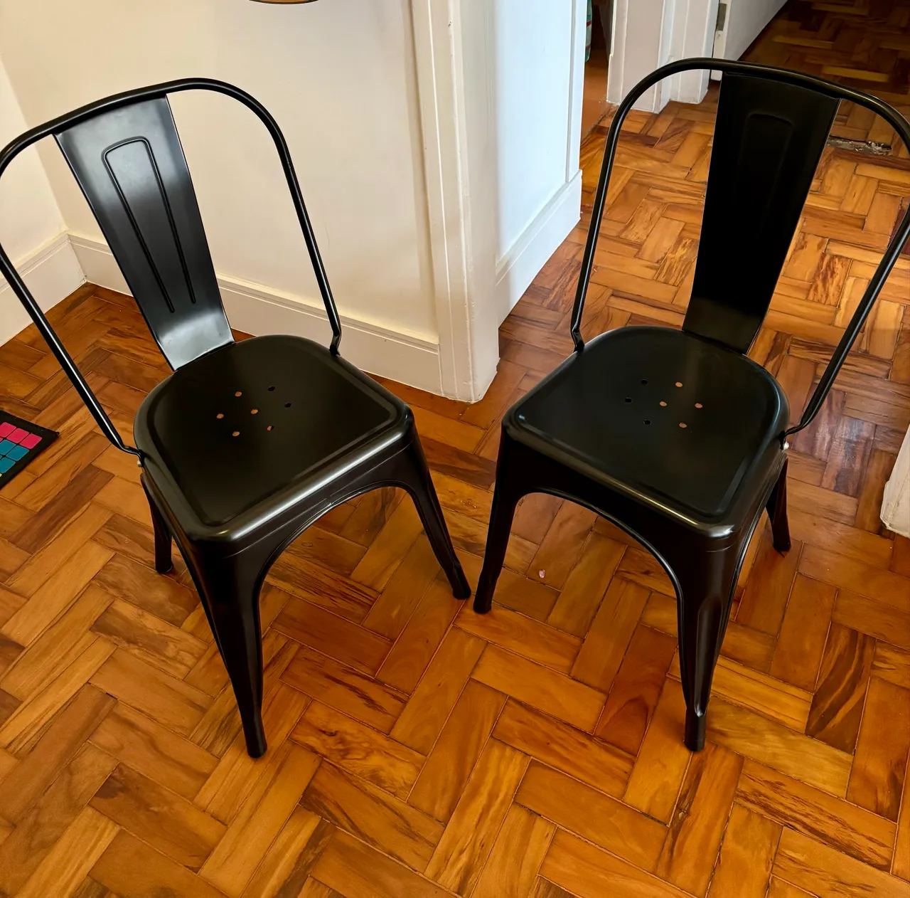 Duas cadeiras Tolix cor preto fosco. As duas por 260,00 Retirada no Anhangabaú. Uma cadeira tem uma mancha na parte de trás (cf. Foto). Já veio assim.