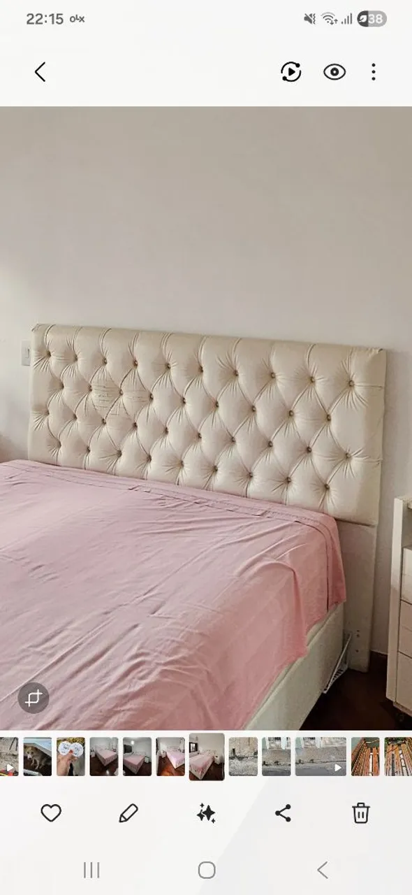 Cabeceira tamanho Queen, modelo capitonê, na cor branca, em corino com fissuras. Tam. 1,27 altura x 1,65 largura.
