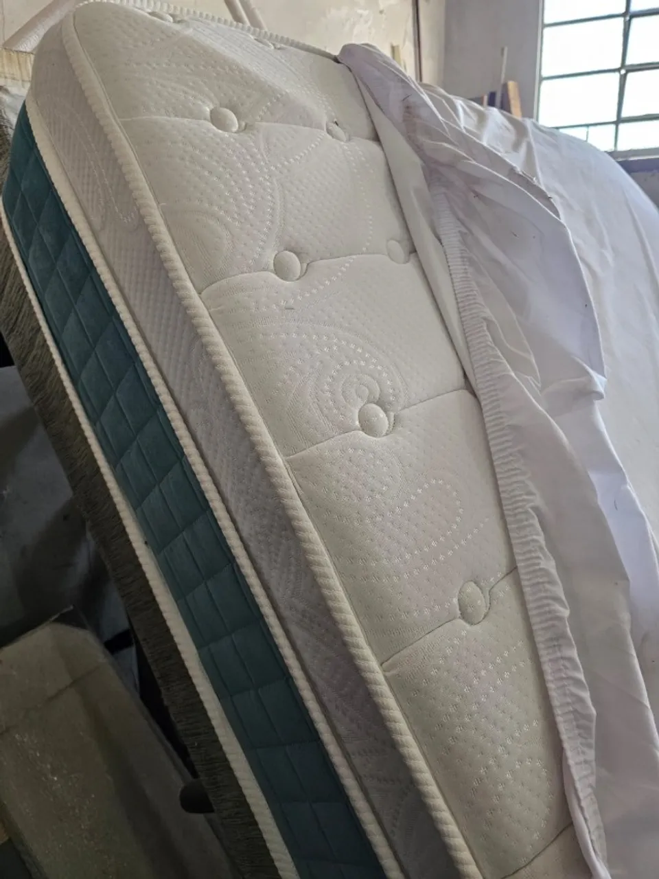 Produto está guardado em garagem, mas possui capa no colchão.