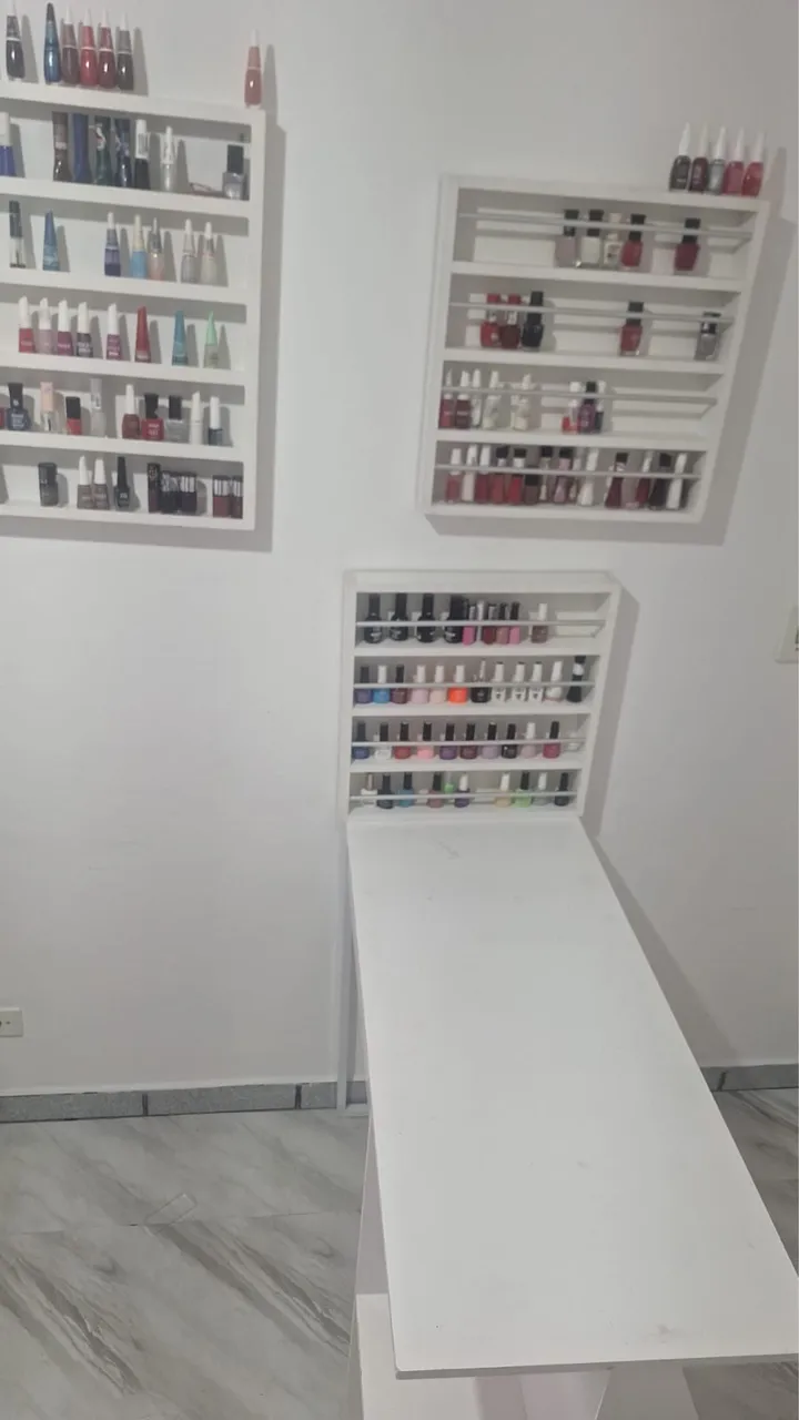 Conjunto perfeito para o seu espaço de manicure! Inclui mesa espaçosa e prateleiras para organização impecável de esmaltes e materiais.