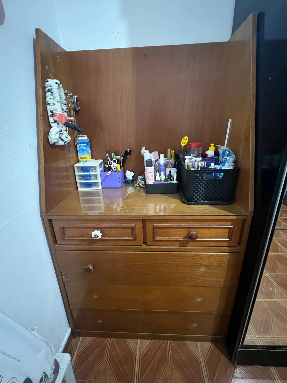 Linda penteadeira de MADEIRA, perfeita para organizar seus produtos de beleza. Design clássico e funcional, com gavetas espaçosas. Não entrego.