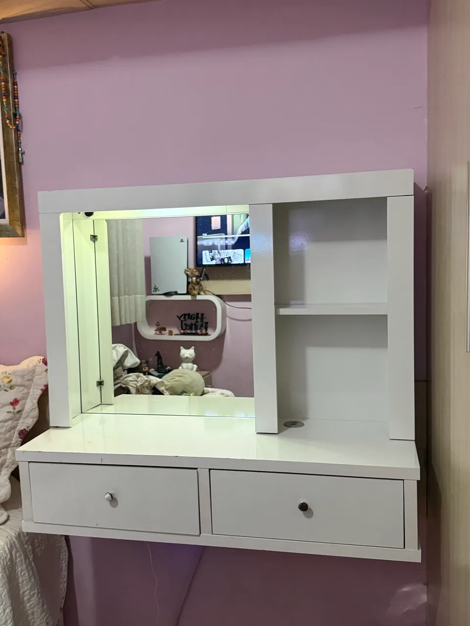 Linda penteadeira de parede, perfeita para otimizar o espaço do seu quarto. Design moderno e funcional, com espelho e gavetas espaçosas para organizar seus itens de beleza. Ideal para quem busca praticidade e estilo!