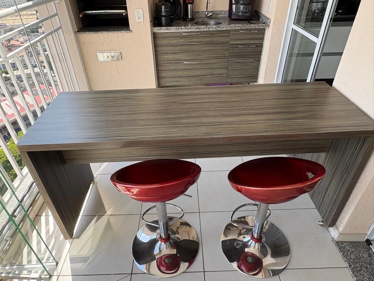 Bancada alta utilizada como apoio para churrasqueira, versátil e funcional.