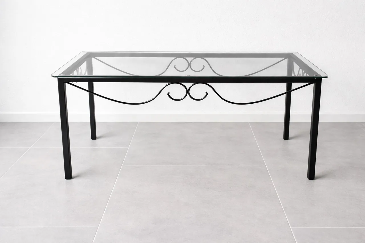 Linda mesa de ferro com tampo de vidro, perfeita para compor sua sala de jantar ou escritório. Design elegante e durável, ideal para diversos ambientes.