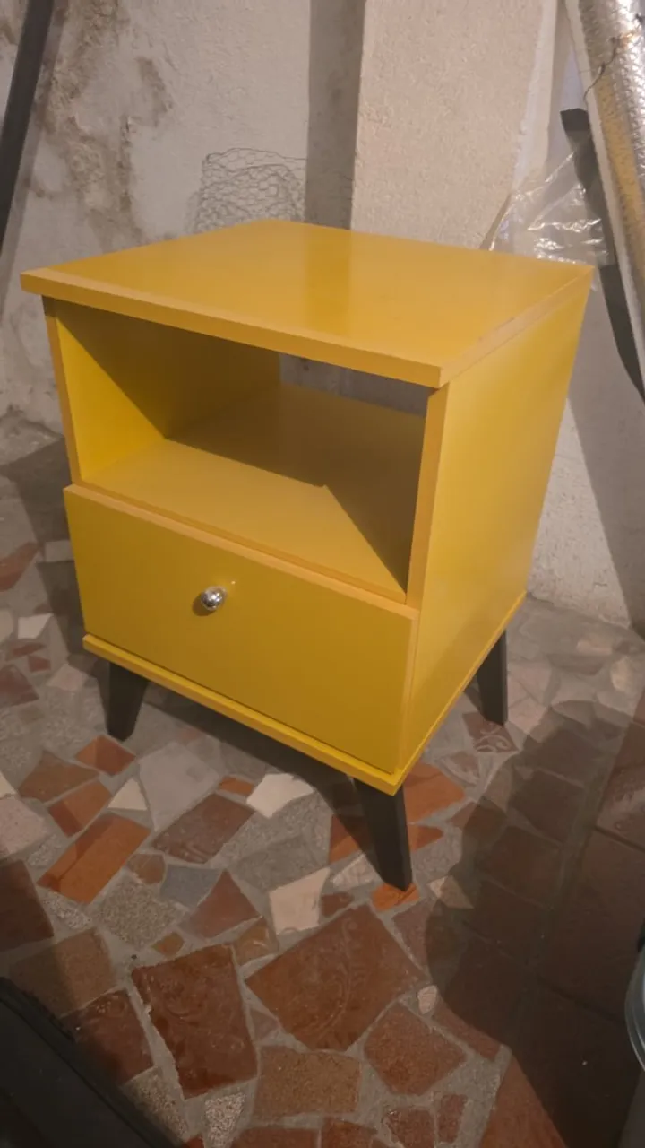 Lindo criado mudo amarelo, perfeito para complementar seu quarto com estilo e funcionalidade. Design moderno e prático, ideal para organizar seus objetos pessoais.