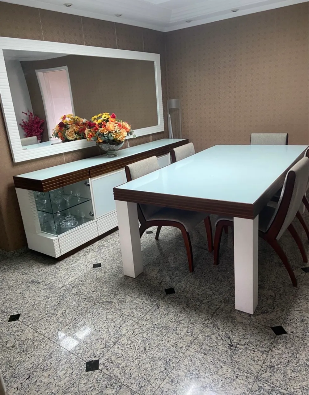 Conjunto completo para sua sala de jantar! Mesa elegante com tampo de vidro, acompanhada por 5 cadeiras confortáveis e um buffet charmoso com espelho. Perfeito para receber e decorar seu ambiente com sofisticação.
