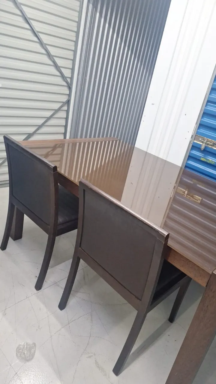 Mesa de jantar com pés de madeira maciça em tom escuro e tampo de vidro com fundo escuro. 6 cadeiras de madeira maciça com estofado em napa.