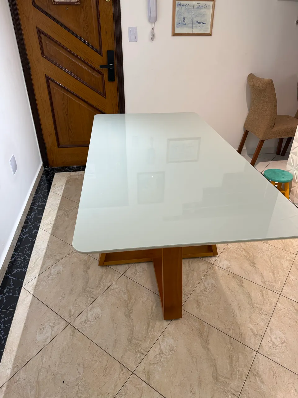 Linda mesa com tampo de vidro, medindo 1,60X0,80. Comprada em Julho, está nova, não acompanha cadeiras. Sou de Santo André