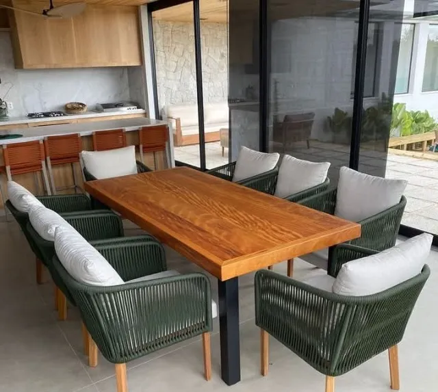 Linda mesa retangular para sua área gourmet! Perfeita para reunir amigos e familiares, com design elegante e moderno. Detalhes em madeira que trazem aconchego e sofisticação ao seu espaço.