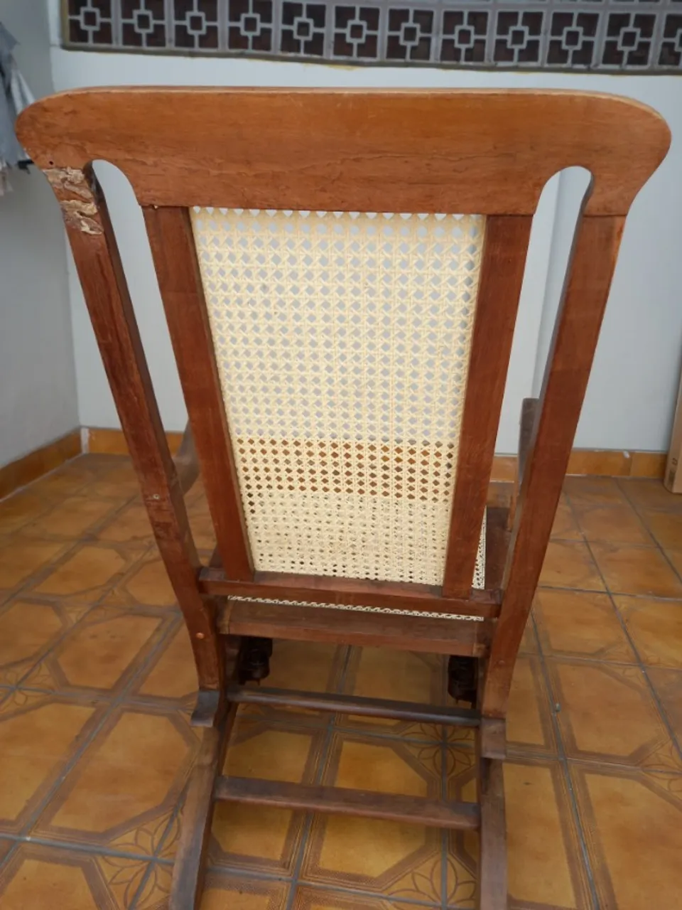 Madeira maciça, assento e encosto em tela. Bom estado e com pequeno sinais de reparo na fixação dos braços. Molas em perfeito funcionamento, silencioso, sem rangido. Antiguidade para os colecionadores ou apreciadores de móveis rústicos.Um toque requintado para o seu lazer: leitura ou cochilo. Medidas: Compr. 80 cm. Altura: 105 cm. Largura: 68 cm .