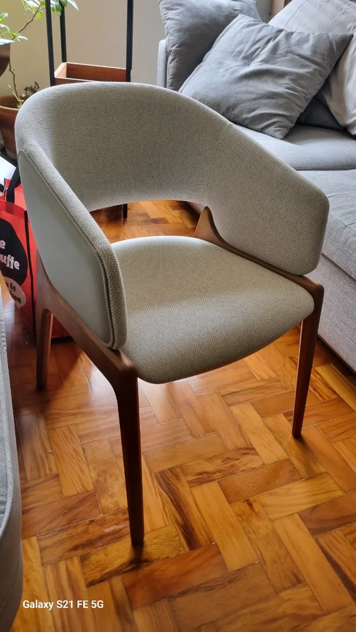 Poltrona de design moderno, revestida em tecido de alta qualidade, ideal para complementar a decoração da sua sala de estar. Pés em madeira com acabamento feito a mão.
