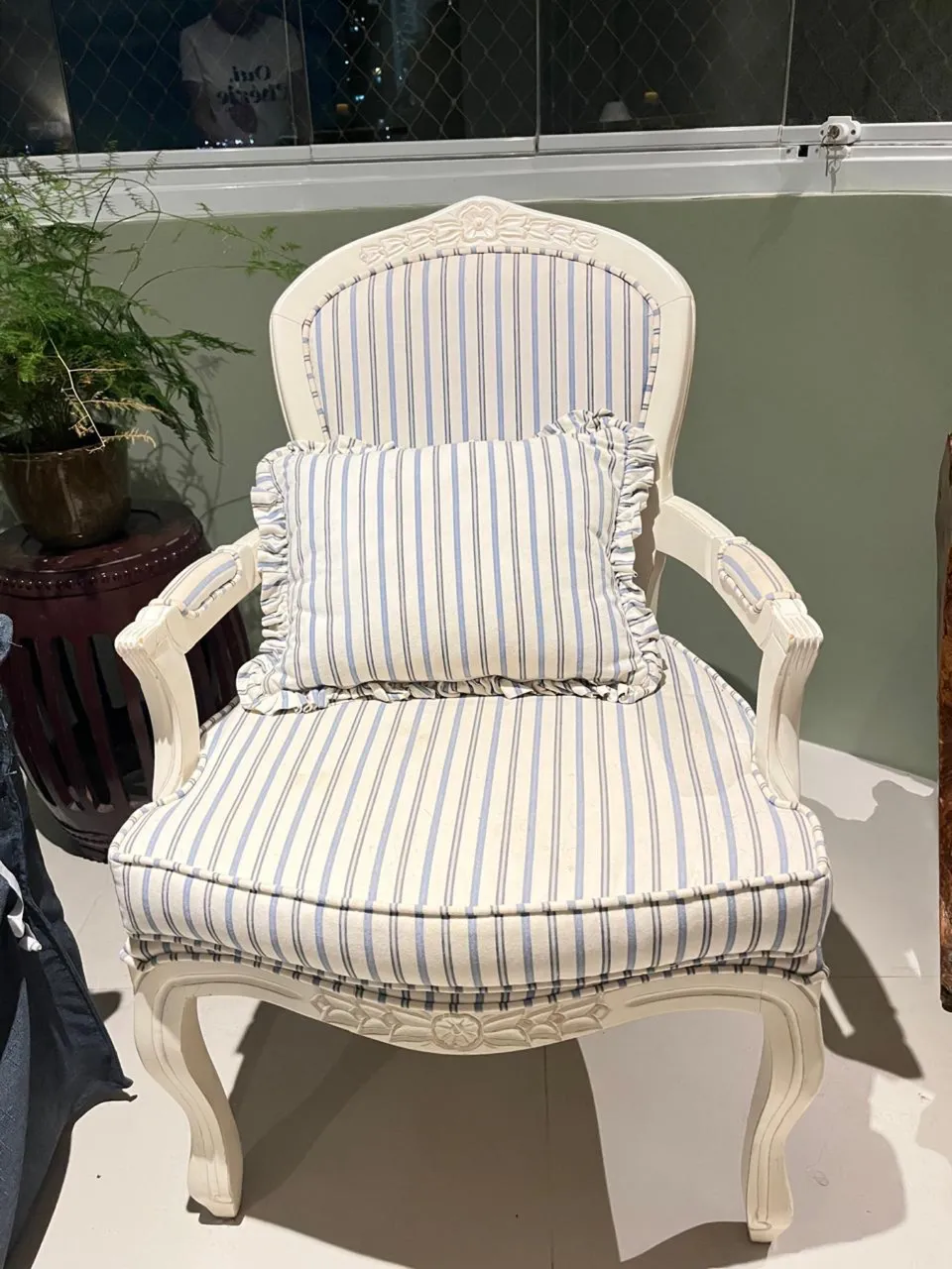 Cadeira provençal com braços no estilo clássico francês Luís XV, entalhes de arabescos - pintura branca provençal e estofamento em tecido listrado - acompanha almofada - 100cm x 60cm x 44cm - peça única - R$1.440,00