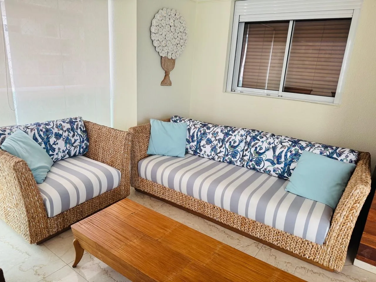 Medidas: 2,15 por 1,00 Sofá em ótimo estado tendo tido uma única dona (decoradora). Tecido impermeável. Estrutura de folha de bananeira.