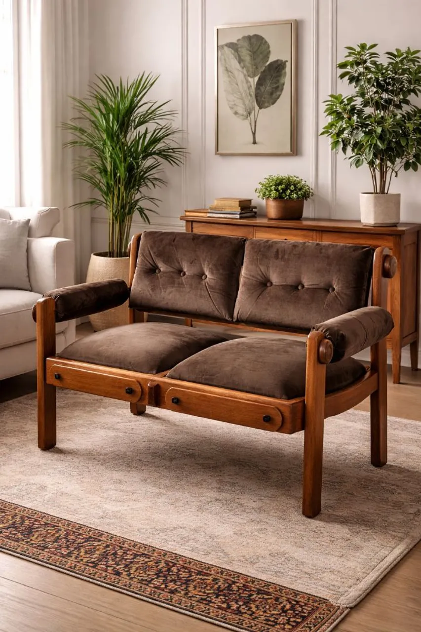 Essa charmosa namoradeira de dois lugares é uma peça clássica e extremamente elegante, ideal para quem busca conforto aliado a um design atemporal. Sua estrutura é toda em madeira maciça, com acabamento natural que valoriza os veios e garante resistência e durabilidade. ?