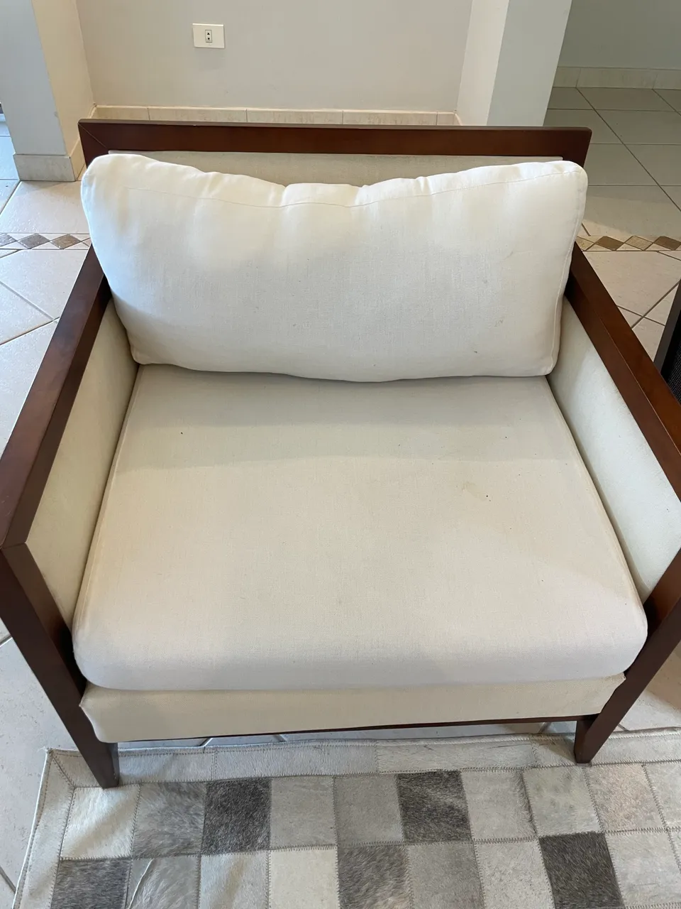 Lindas poltronas em tecido branco com as costas de madeira! Super confortável e atemporal. Aceito ofertas!