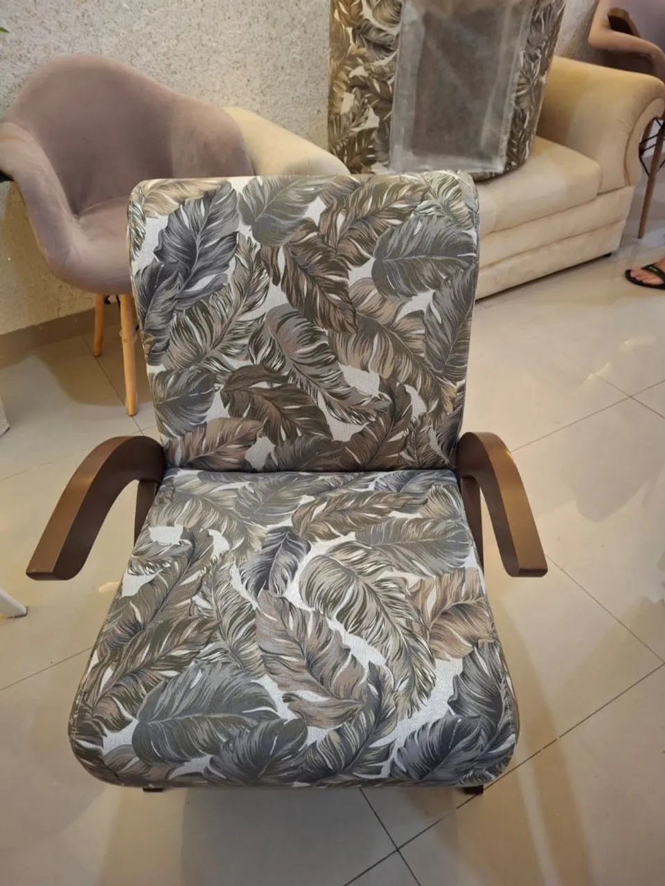 Linda poltrona com design moderno e confortável. Perfeita para relaxar em sua sala de estar ou escritório. Com estampa charmosa em tecido aquablock e braços de madeira, adiciona um toque de elegância ao ambiente.