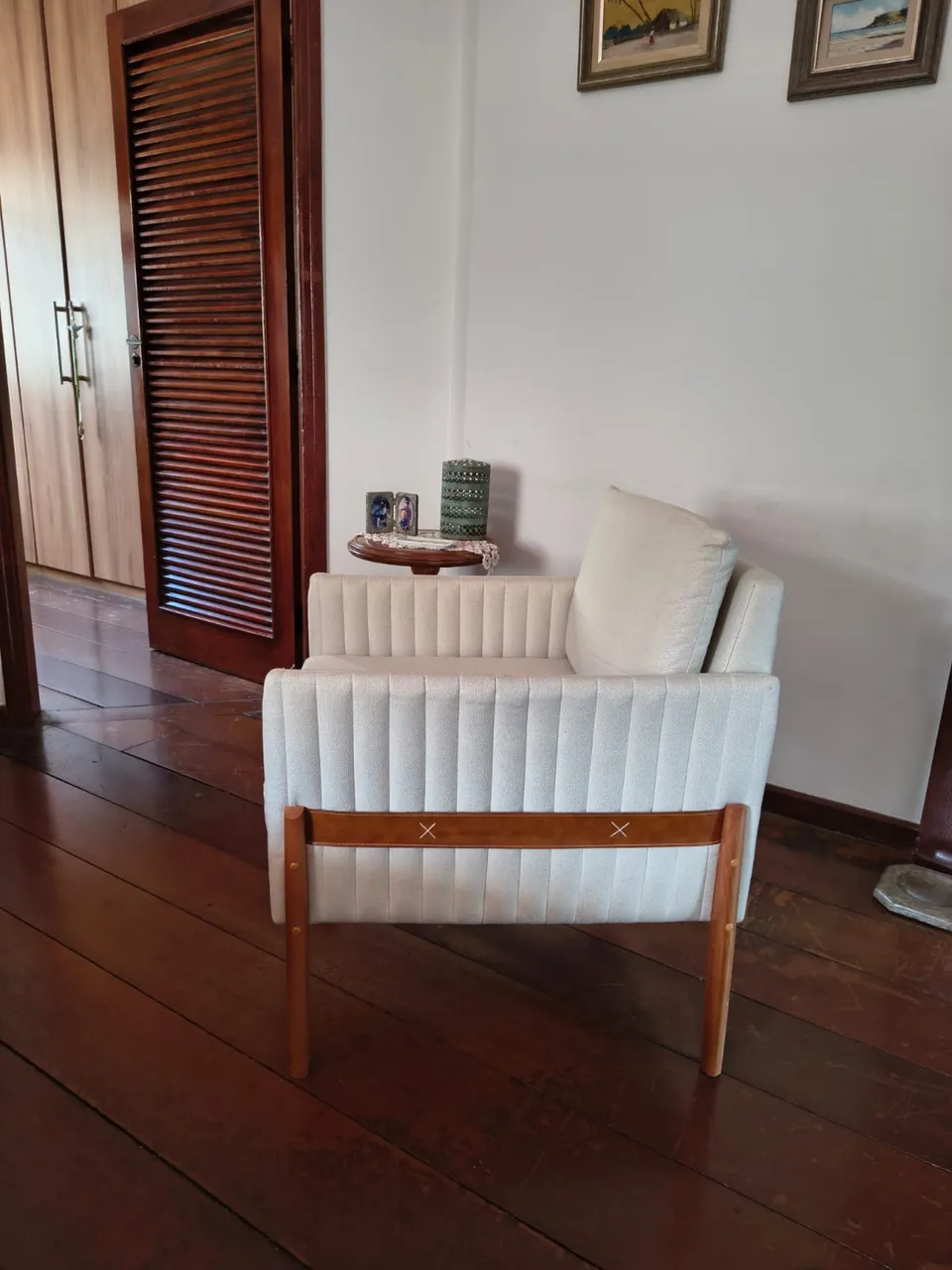 Linda poltrona decorativa, perfeita para dar um toque de elegância e conforto ao seu ambiente. Design moderno e acabamento impecável, ideal para sala de estar, quarto ou espaço de leitura . Pés em madeira e detalhe lateral em couro. Confortável e elegante. Retirada no bairro de Interlagos.