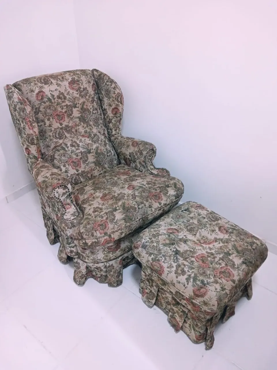 Conjunto composto por uma poltrona e um puff, ambos com design clássico e estofados em tecido floral. Perfeitos para adicionar um toque de charme e sofisticação à sua sala de estar. Tamanho Poltrona 74x96x80 , Tamanho Puff 50x50x42