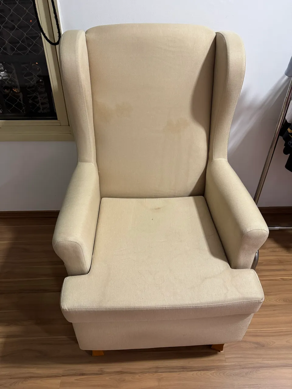 Linda poltrona bege, perfeita para relaxar e decorar seu ambiente. Design clássico e confortável.