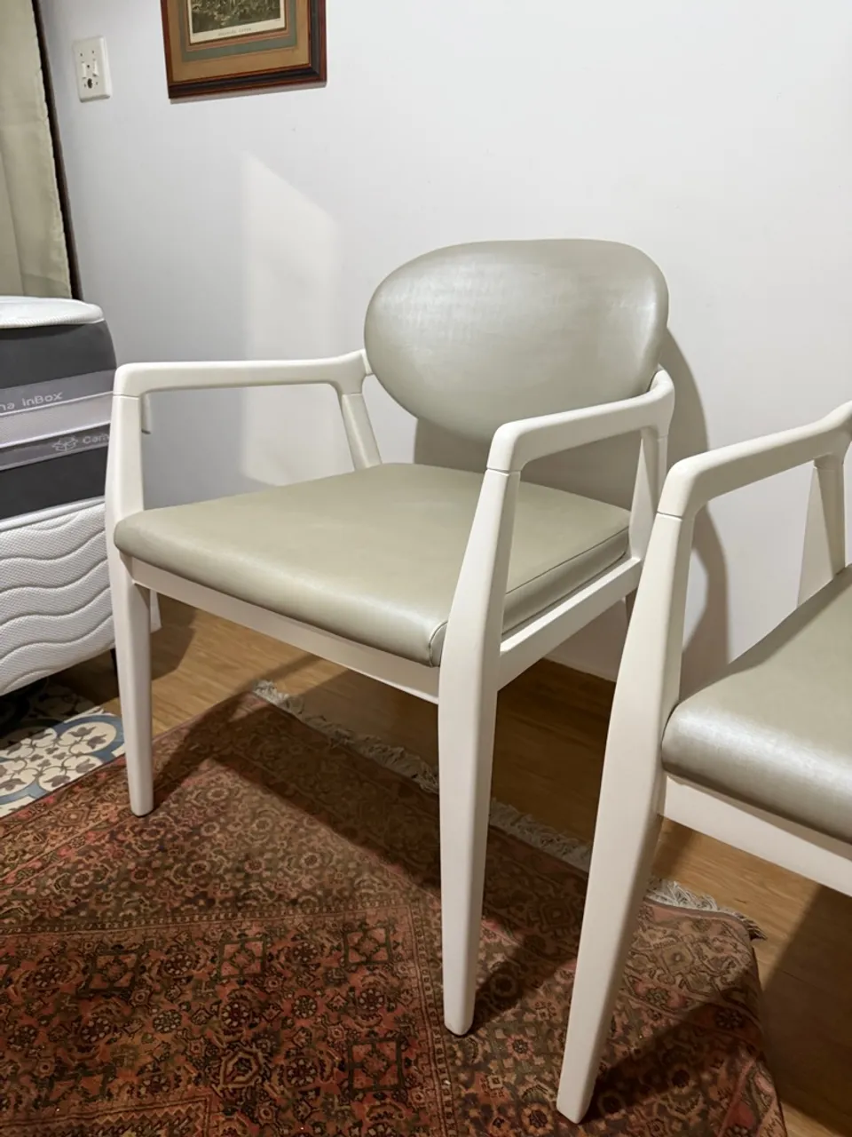 6 Poltronas Breton em madeira maciça laqueado na tonalidade branca com acento e encosto em sintético na cor cinza claro . Medidas 70cm altura 60 cm comprimento e 50 cm de largura . Duas das cadeiras apresentam mínimas avarias como pequenos furinhos (arranhados) no assunto. Já