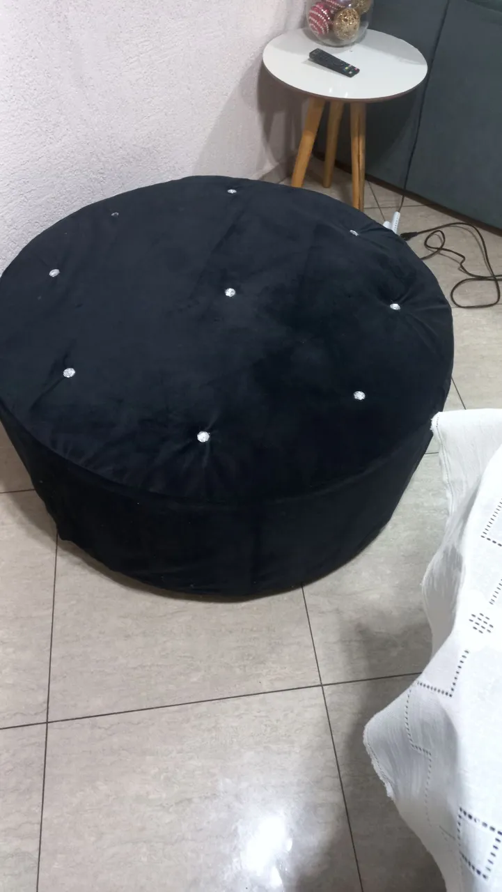 puff preto está forrado com tecido camurça, mas ele é original de courino marrom.