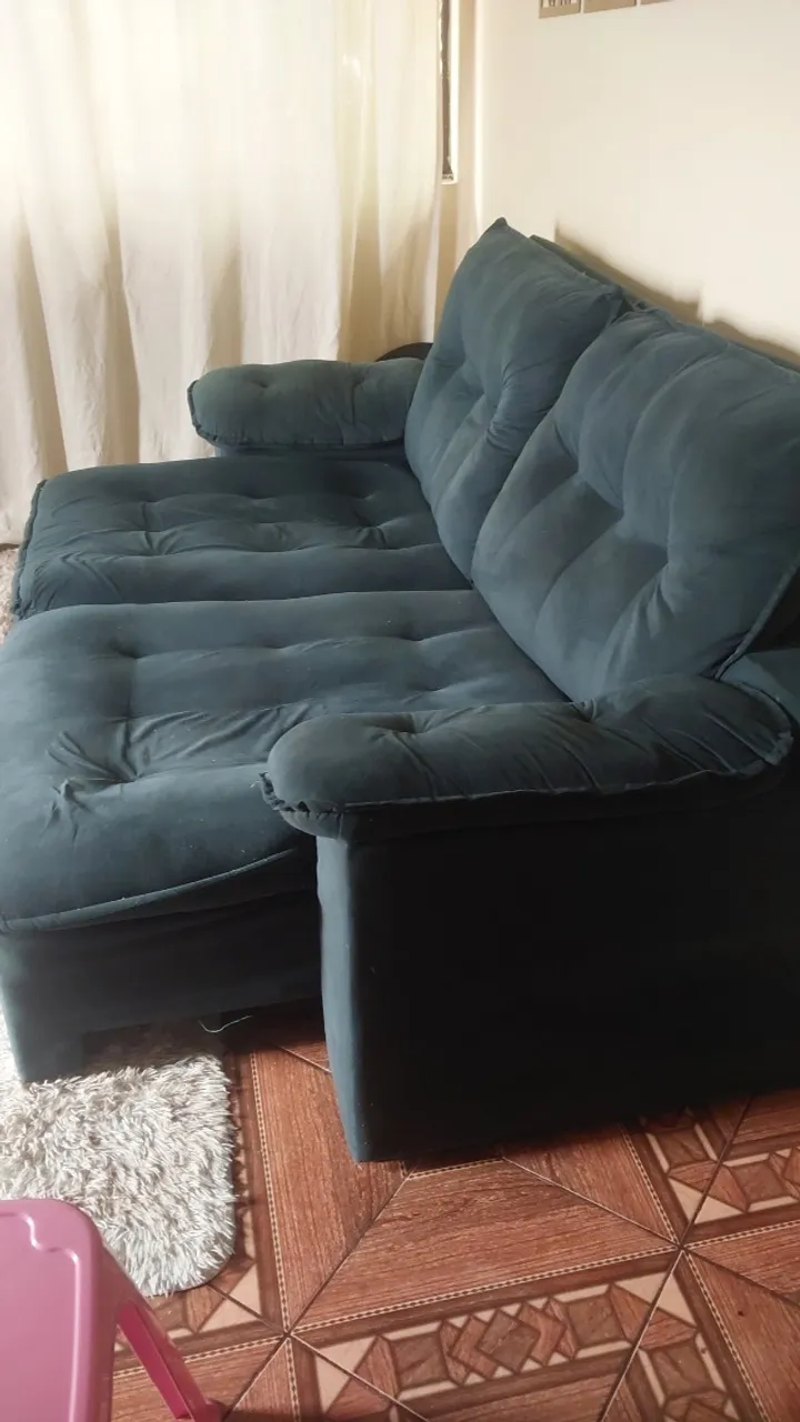 Sofá confortável e espaçoso, 3 lugares, tecido parecido com veludo. Reclinável. Para retirar previsa vir com ajudante.