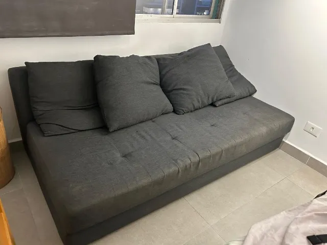 Estofado em tecido cinza escuro, acompanha três almofadas grandes.