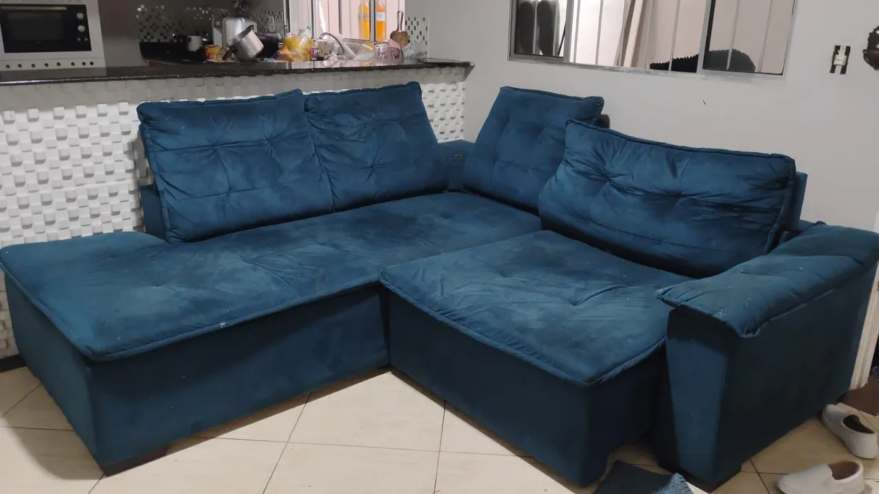 Sofá com carregador USB em L , retrátil e confortável. Medida 2,30x 2,40 Tecido de Veludo Azul
