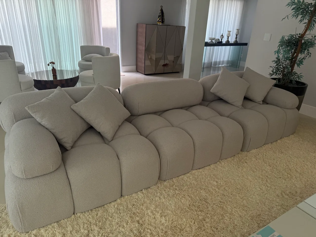 Sofá modular em tecido bege claro, ideal para compor ambientes modernos e aconchegantes. Design diferenciado e confortável.